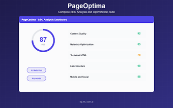 PageOptima är ett kraftfullt verktyg som erbjuder en omfattande lösning för SEO-optimering direkt i din webbläsare. Denna kostnadsfria tillägg för Chrome möjliggör snabba och detaljerade granskningar av innehållskvalitet, metadata, teknisk HTML, länkstruktur och mobilresponsivitet. Med hjälp av AI-genererade metataggar och avancerade algoritmer för analys av nyckelord, får användare möjlighet att optimera sina webbplatser med precision. Dessutom kan bilder granskas för alt-text och optimering, vilket förbättrar den övergripande SEO-prestandan.